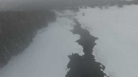 新疆喀纳斯穿越机飞过雪松雾气