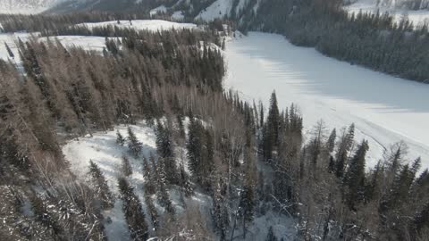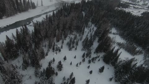 新疆喀纳斯穿越机飞过雪松