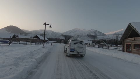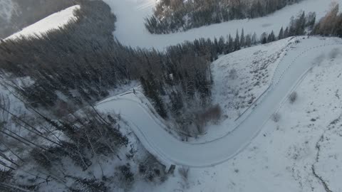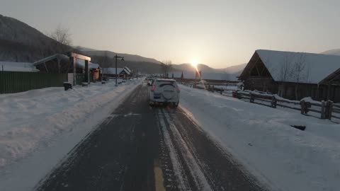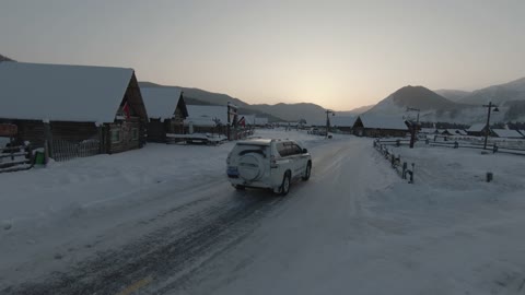 新疆黄昏雪地穿越机高速跟车 禾木
