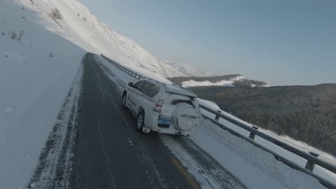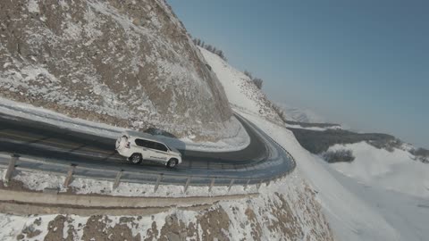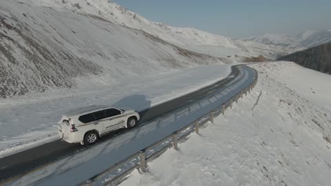 新疆黄昏雪地穿越机高速跟车