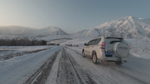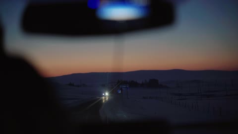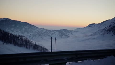 新疆公路车上拍摄远处黄昏雪景