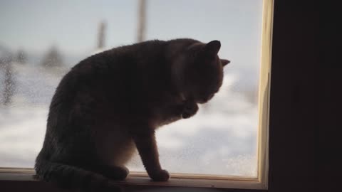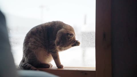 新疆禾木村庄猫咪在室内梳理毛发
