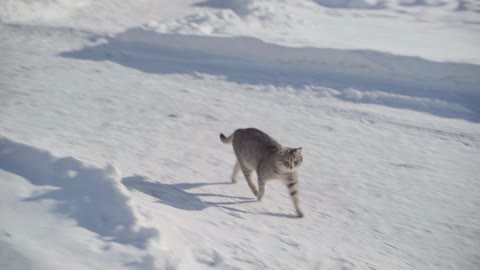 新疆禾木村庄猫咪蹲在雪地01