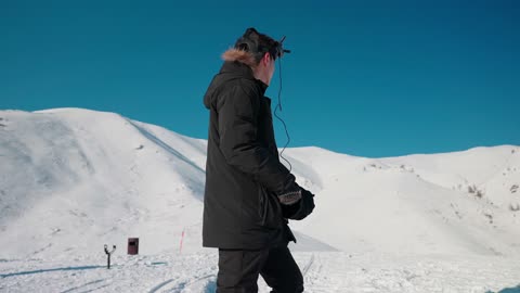 新疆禾木雪地里女生帮忙调整衣物