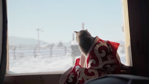 新疆禾木村庄猫咪在室内看向远方
