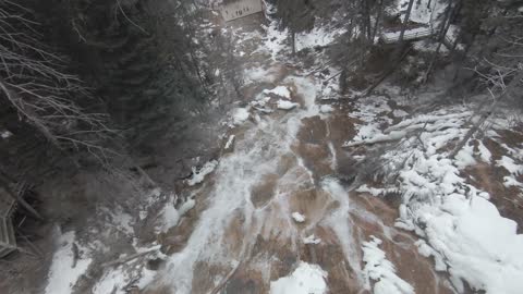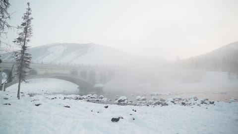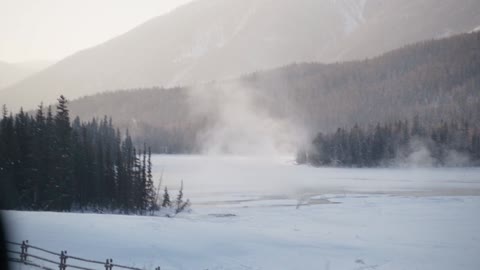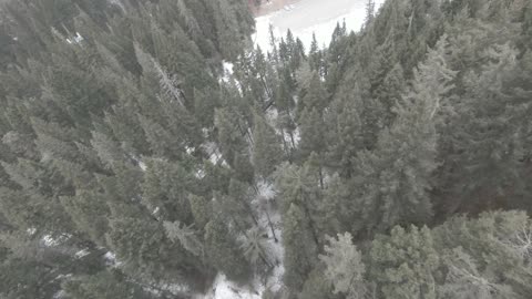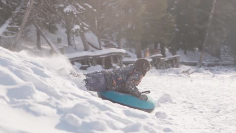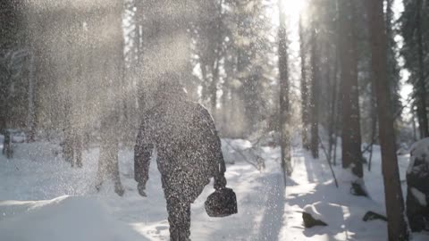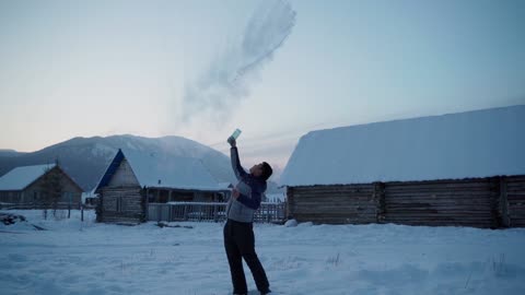 新疆喀纳斯月亮湾飘雪玩雪的男生