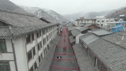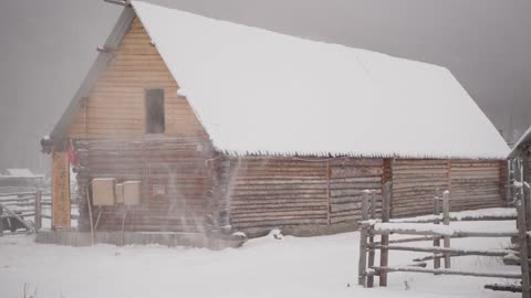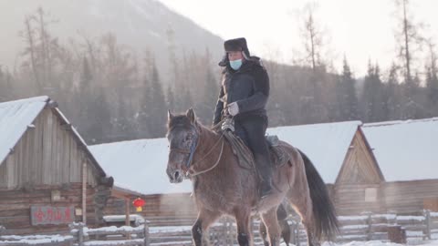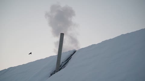 新疆喀纳斯村庄房屋上背风吹落的积雪