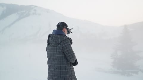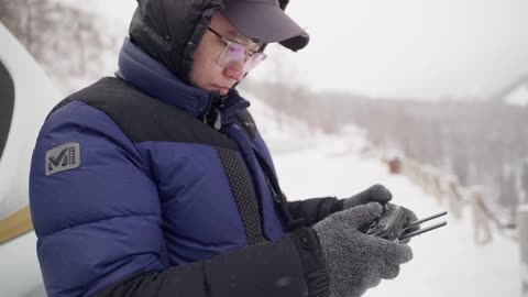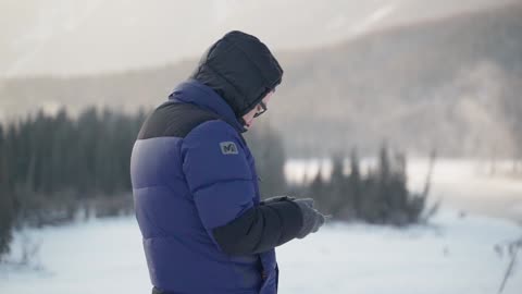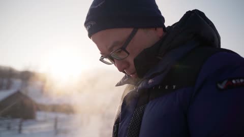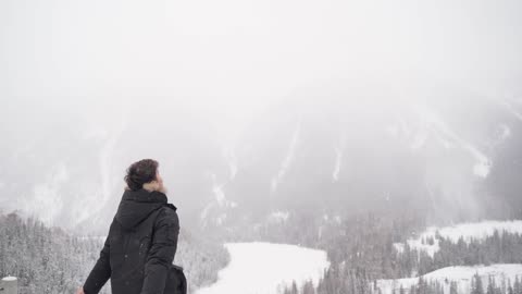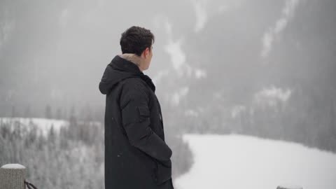 新疆喀纳斯月亮湾飘雪看向远处的男生