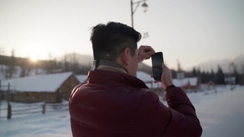 新疆喀纳斯村庄屋外男生用手机拍摄