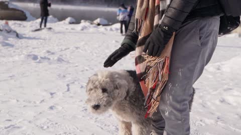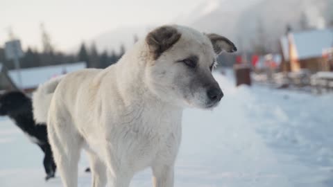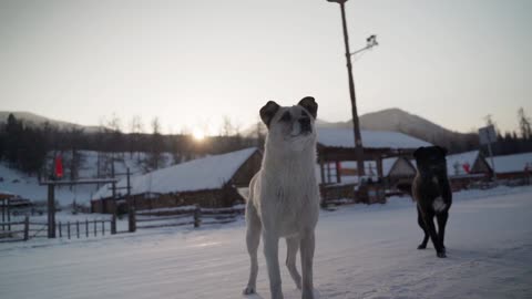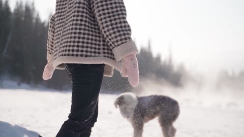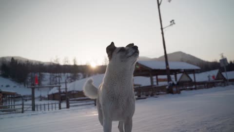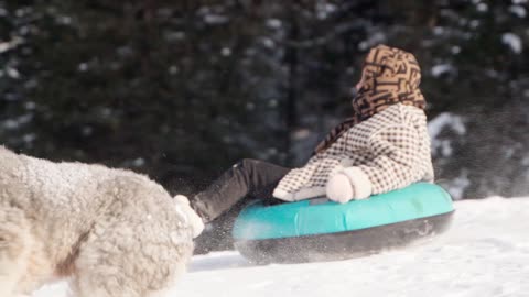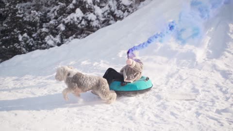 新疆喀纳斯从雪坡上滑雪的女生小狗奔跑