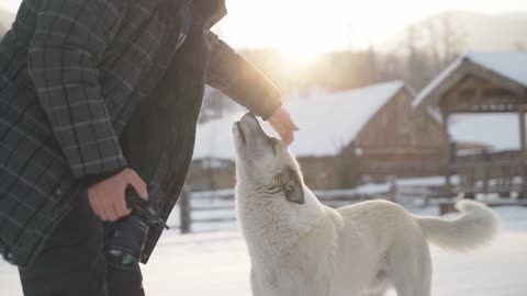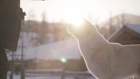 新疆喀纳斯村庄屋外男生用食物逗小狗升格逆光