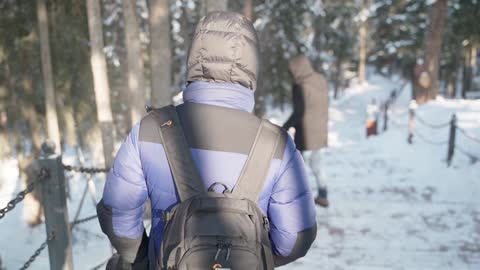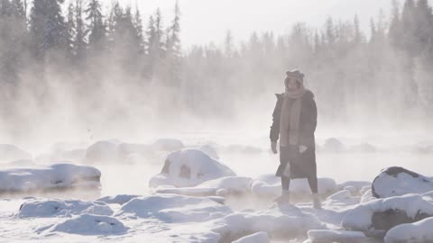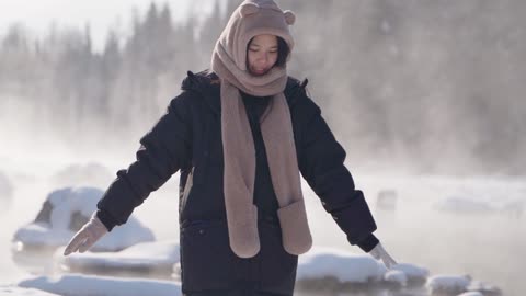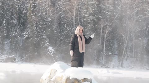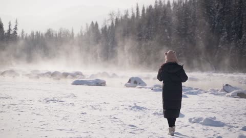 新疆喀纳斯雪地里女生蹦蹦跳跳