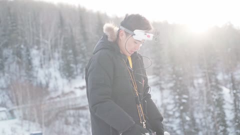 新疆喀纳斯村庄屋外男生操作无人机逆光升格