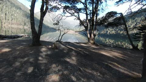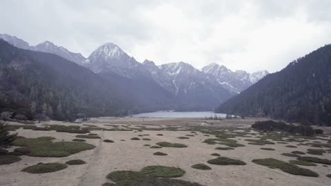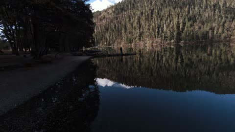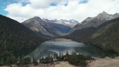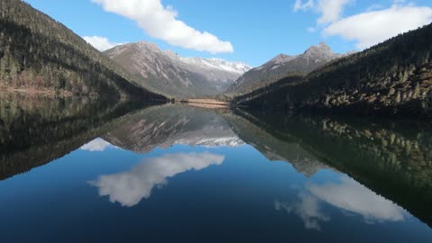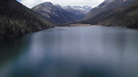 川西马尼干戈航拍湖面慢慢抬头雪山